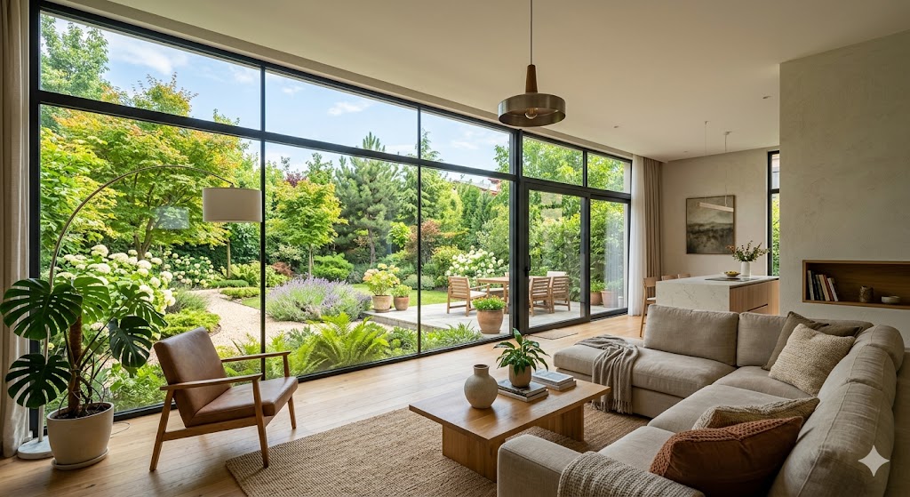 ვიტრაჟული ფანჯრები: იატაკიდან ჭერამდე ფანჯრები ოთახს ვიზუალურად აფართოებს და ეზოს ხედს ინტერიერის დეკორად აქცევს.